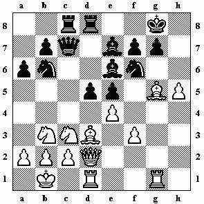 1.Dc2 Sf4+! 2.gxf4 Dxf4 3.Tg1 Lxd4 4.Kf1+ Kh8 5.Te2 Tc8 6.Db1 Lf6 Schwarz hat volle Kompensation für das Figuropfer: Es droht e6-e5-e4, im weißen Lager herrscht Disharmonie und der König steht schwach.