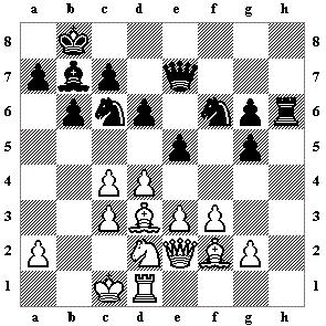 1. d4 Sf6 2. c4 e6 3. Sc3 Lb4 4. Sf3 b6 5. Lg5 Lb7 6. e3 h6 7. Lh4 Lxc3+ 8.