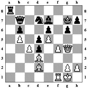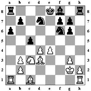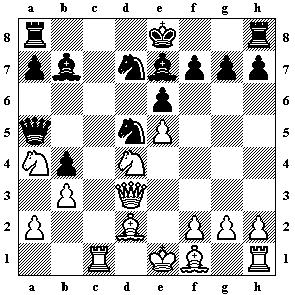 11.Ld3 Sa3 12.Te1 Kf8 13.La6! g5 14.h4 h6 15.hxg5 hxg5 16.Te4 Kg7 17.Txb4 Sxe5