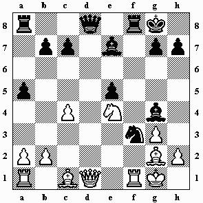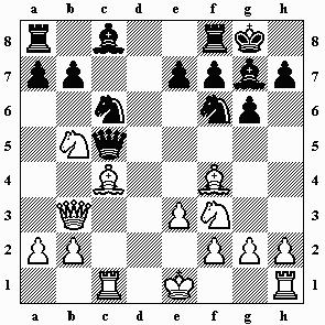 1.d4 Sf6 2.Sf3 g6 3.c4 Lg7 4.Sc3 d5 5.Lf4 0–0 6.e3 c5 7.dxc5 Da5 8.Tc1 dxc4