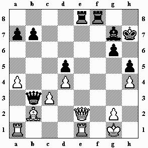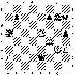 3.Kg4 Kg6 4.Dd6+ f6 5.De6 mit Ausgleich.) 3.Kg2 Df5 4.Dc4 b5 5.Dd4 mit