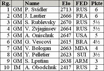 Sieger wurde der Elo-Favorit Peter Svidler (nach Zweitwertung) punktegleich