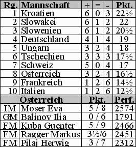 Ich hatte die angenehme Aufgabe als spielender Kapitän ein sehr starkes, junges österreichisches Team zu betreuen. Am 1. Brett erreichte Eva Moser das unglaubliche Score von 5 aus 8, was die Bronzemedaille auf dem ersten Brett bedeutete. Trotz Verkühlung schuf Günter Kuba seine 2. IM-Norm. Gratulation! Der 16-jährige Markus Ragger demonstrierte erneut seine Reife und Stärke. Leider musste er bereits nach der 6. Runde abreisen. Sehr solides Schach spielte auch Herwig Pilaj, wobei sein Potential noch höher lag. Über meine eigene Leistung als Spieler kann man nur rätseln. Meine schwarze Serie ist auf jeden Fall nicht rational erklärbar. Als Genugtuung muss man die Leistung des Teams ansehen. Wir erreichten den 8. Platz, was über unseren Erwartungen lag. Offen bleibt die hypothetische Frage: was wäre wenn ich auch meinen Beitrag geleistet hätte?