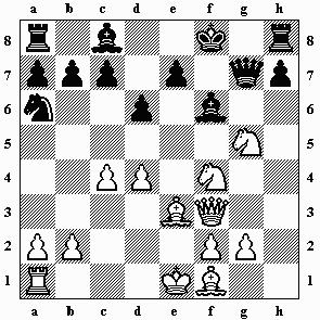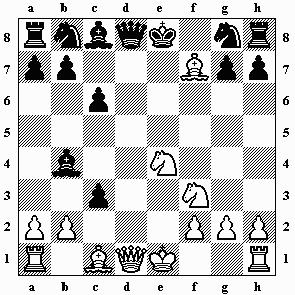 g6 9.De2 fxe4 10.Lc3 De7 11.Dxe4 Sf6 12.Lxf6 Dxe4+ 13.Lxe4 Tg8 mit einem Bauern
