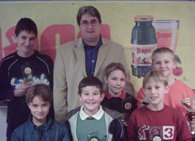 vorne von li nach re: Tarmastin Laura (bestes Mädchen), Ravnjak Marco (Sieger U8), Mrakotsky Mario (2. in U10), Wertjanz David (Sieger U10), Feinig Mario (Gesamtsieger und Sieger U12)